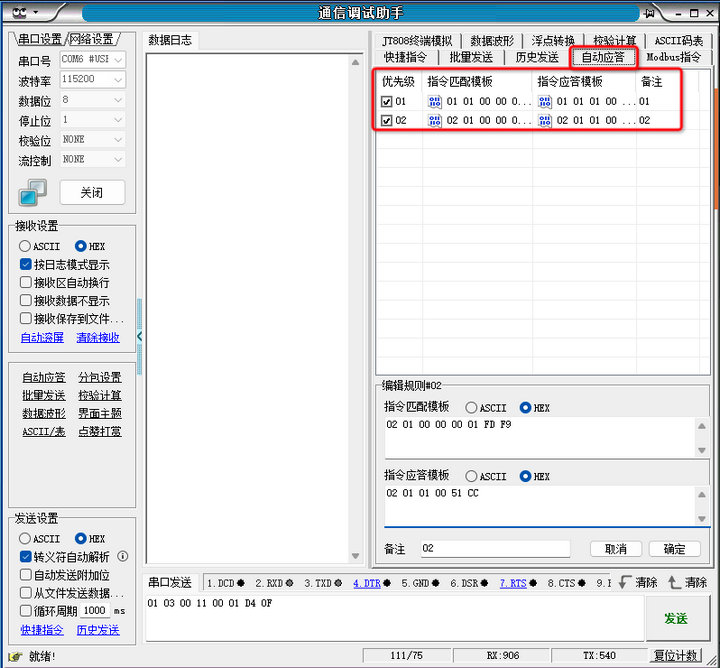 与多主机模式一样,使用调试软件的自动应答功能模拟实际使用。