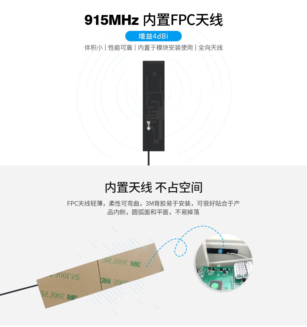 | TX915-FPC-3009 | FPC内置天线 | 915M | IPEX-1 | 50 | 2.5 | ≤1.5 | 30*9mm | 100mm | 适用于各种915MHz频段的终端设备 | ||