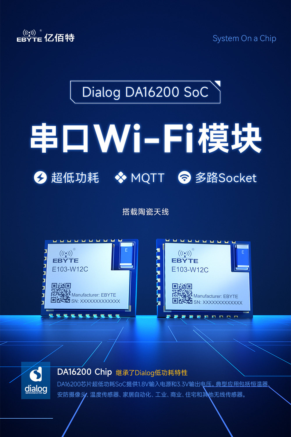 | E103-W12X | UART | DA16200 | 2.4G | 20 | 0.5 | 802.11 b/g/n | IPEX | 16*13*2.7 | 超低功耗、支持多种传输协议 | ||