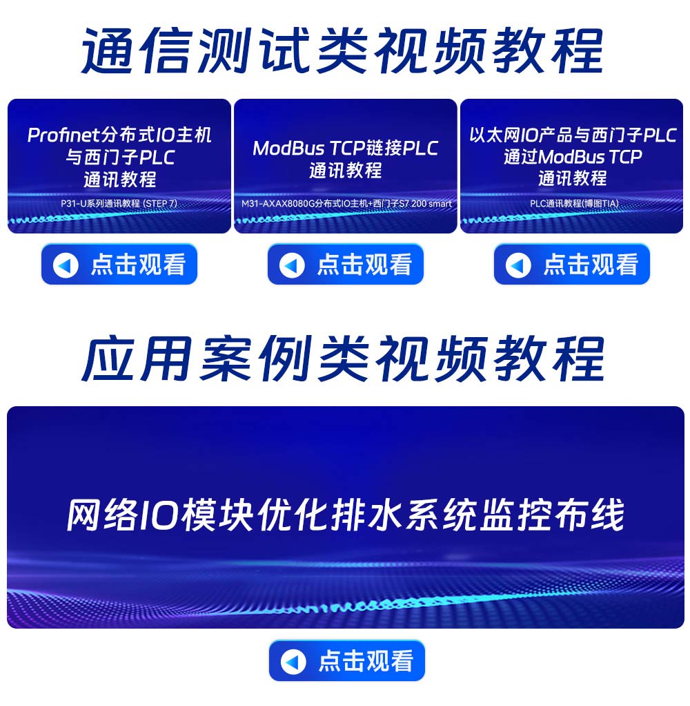 产品简介:P31-U系列是一款支持Profinet协议的远程分布式IO主机模块,用于将IO数据映射到Profinet。使用GSD文件进行集成,PLC免代码读取、写入I0端口。支持西门子S7-200smart、S7-300、1S7-200、S7-1500以及S7-1500在内的多种西门子PLC型号。具备两个网口,支持交换机功能,并集成了Profinet转Modbus RTU网关功能。产品喷涂三防漆,具有“防霉菌”“防潮湿”“防盐雾”等功能。